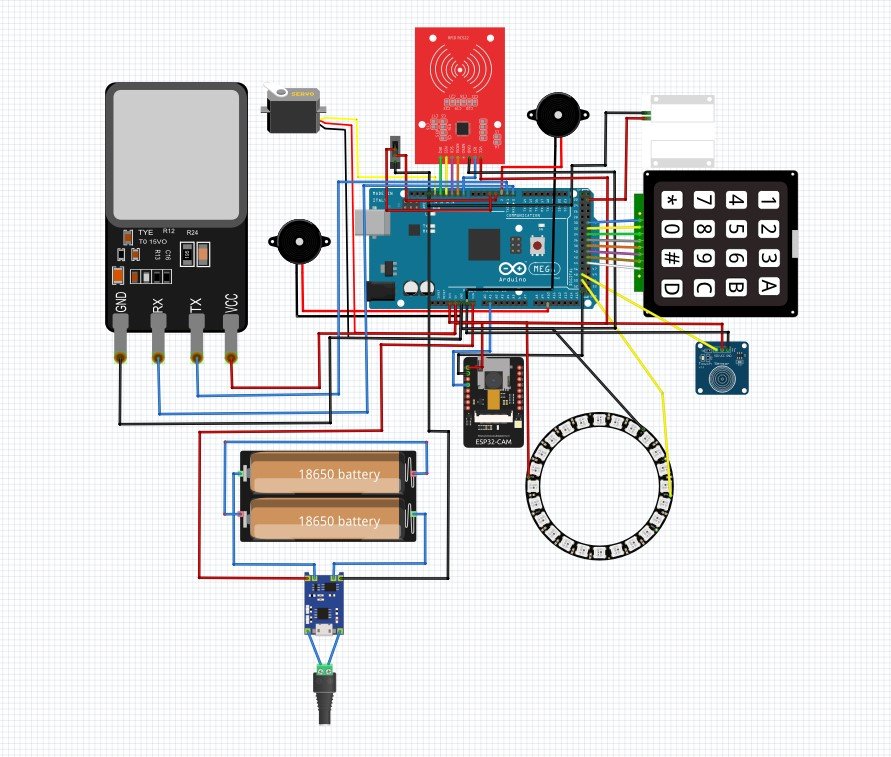 Designed to work with my other designed smart home projects it uses an ESP32 CAM connected to the main Arduino Mega to open the door using a mobile device in addition to the fingerprint scanner, keypad, nfc, and the vibration piezo sensor coded knock. With the reed switch, camera, capacitive touch sensor, LED ring, lithium battery charger, 18650 batteries, SPDT switch, piezo buzzer, and 5V DC jack to power it all. The 18650 batteries are to act as a back up incase the power goes out so the DC jack charges the batteries when it is plugged in and when it is not it uses the batteries to stay on for at leat 3 days. On top of this the 3D printed enclusre and case with M3 screws and black acrylic glass.