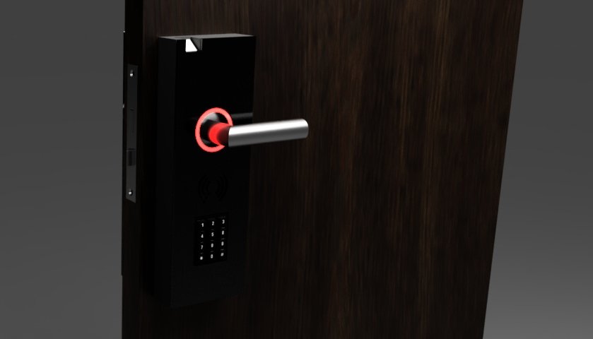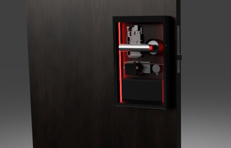 The face includes a keypad for when the other functions are out of use or to give access to someone else. The inside contains an Arduino Mega as the controller which is connected to a battery, a servo motor, and a wifi receiver/transmitter, this means the door can be opened and closed from anywhere in the world with available wifi connection. The outside of the door uses a simple wood frame with black acrylic glass and an LED ring around the door nob which lights green to indicate when the door is open and red to indicate its closed or the password or fingerprint is incorrect. The inside of the door also has a wood frame with black acrylic glass which shows a nice opening to see how the gears open and close the lock. The battery is removable to allow charging, and in the case the battery runs out of charge the dc power which is optionally plugged in will keep it on. The lock uses a camera for survailance on who enters and exits and when they do along with facial recognition to help doing so.
